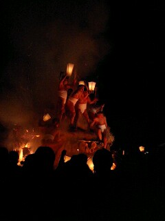 この祭り、厄年の男達が写真のようなスタイルで火のついたやぐらに登ってみたり、「蘇民袋」という麻袋の争奪戦を夜通し行うという、奇祭です。