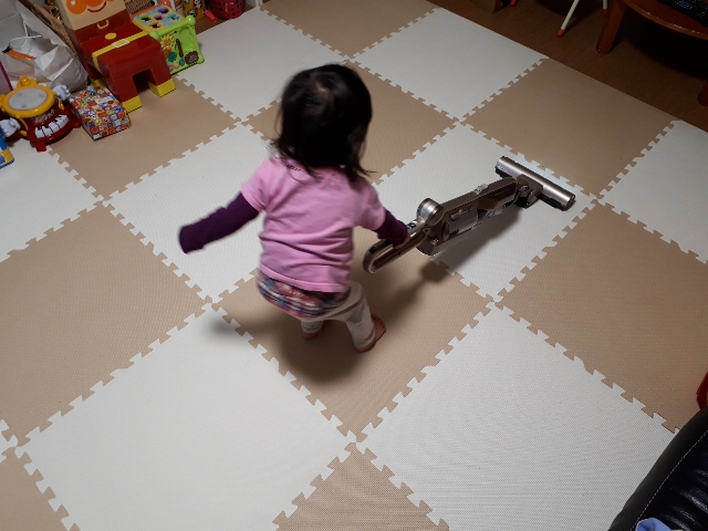 2歳も5ヶ月を過ぎると、掃除機の扱いもけっこう上手。