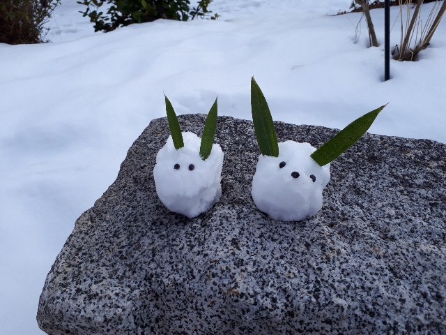 雪ウサギ作ろうとするも、公園にななかまどなかったので、黒い実で代用。
