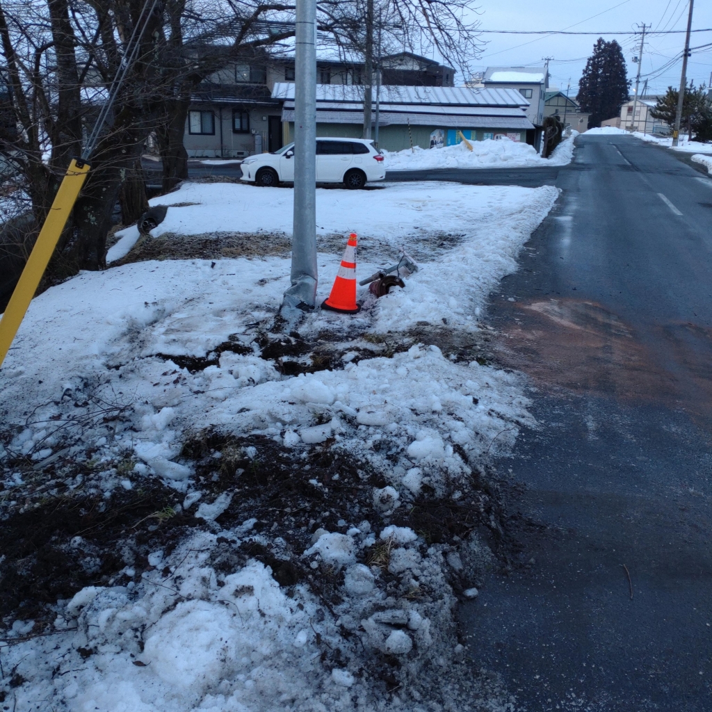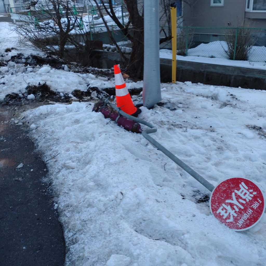 若いお兄ちゃんが乗った車が、居眠りかなんかでカーブ曲がりきれずに消火栓ふっとばして電柱に刺さってた