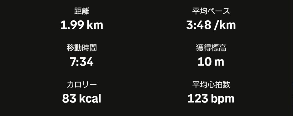 3分48/kmペースでも心拍数は120ちょいしか上がってないので、心肺機能的にはジョギングペースである。が、脚的には結構必死である笑